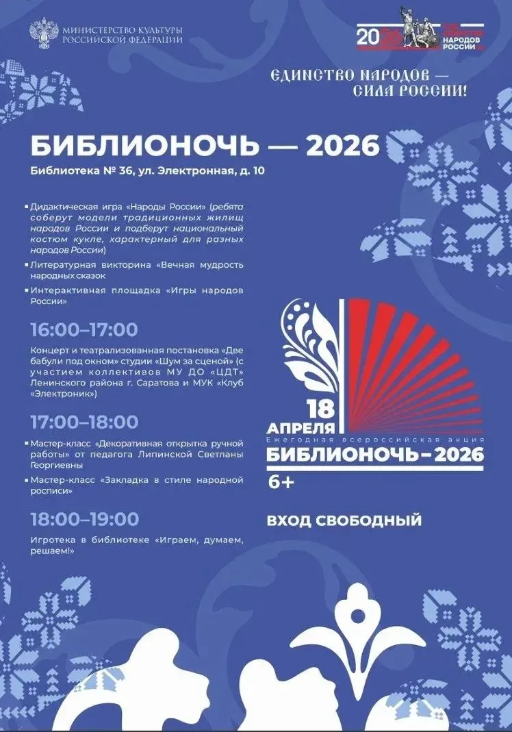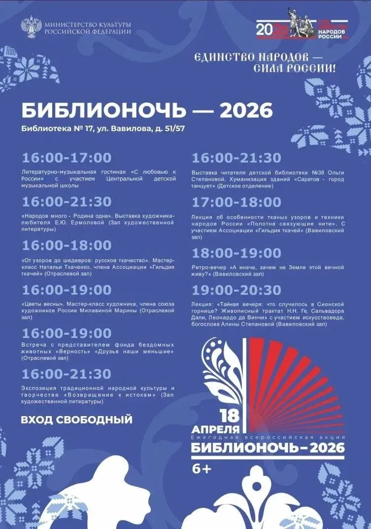 В рамках Всероссийской акции «Библионочь» сегодня для жителей Саратова организована насыщенная программа: литературные викторины, творческие мастер-классы, встречи с писателями и поэтами, а также уютные чтения и музыкальные вечера.