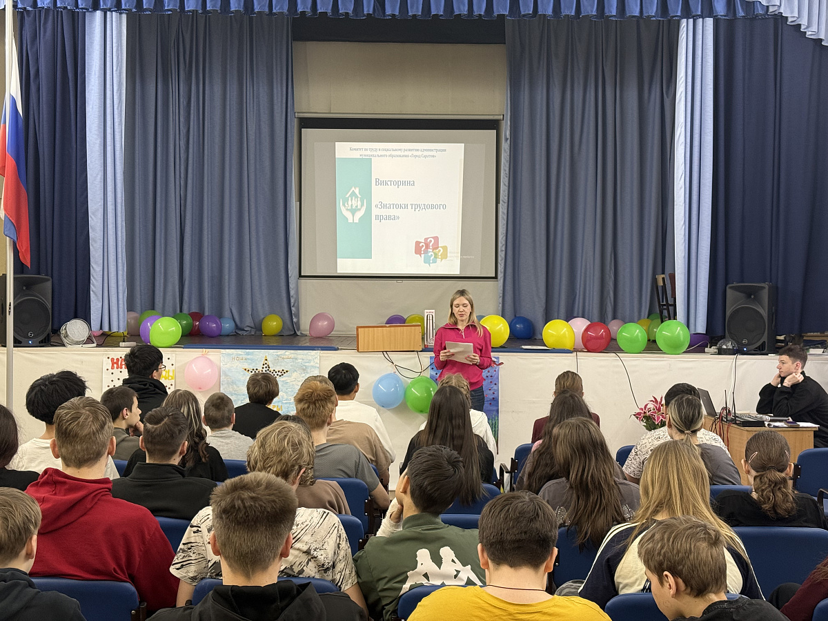 Комитетом по труду и социальному развитию администрации муниципального образования «Город Саратов», в рамках муниципальной программы «Участие в организации временного трудоустройства несовершеннолетних в возрасте от 14 до 18 лет в свободное от учебы время», для подростков, находящихся в санатории «Октябрьское ущелье», проведена викторина «Знатоки трудового права».