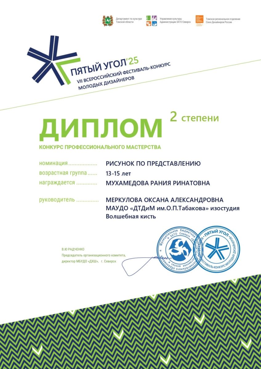 Учащаяся образцового коллектива «Волшебная кисть» МАУДО «Дворец творчества детей и молодежи им. О.П. Табакова» Мухамедова Рания получила диплом 2 степени, поздравляем Мухамедову Ранию с победой в значимом конкурсе