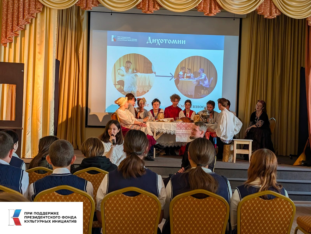 Далее учащиеся посмотрели спектакль молодёжного коллектива «АншантЭ» по мотивам двух повестей русского писателя Н.В. Гоголя «Вот тебе и свадьба!», после которого приняли участие в беседе по поиску духовных ориентиров русского человека.