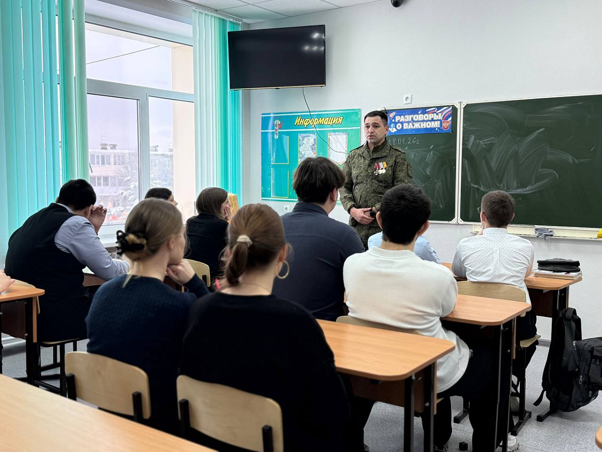 В школе поселка Расково прошел урок мужества для старшеклассников. Гостем встречи стал ветеран специальной военной операции, заместитель начальника департамента Гагаринского района по патриотической работе Ренат Аминов.