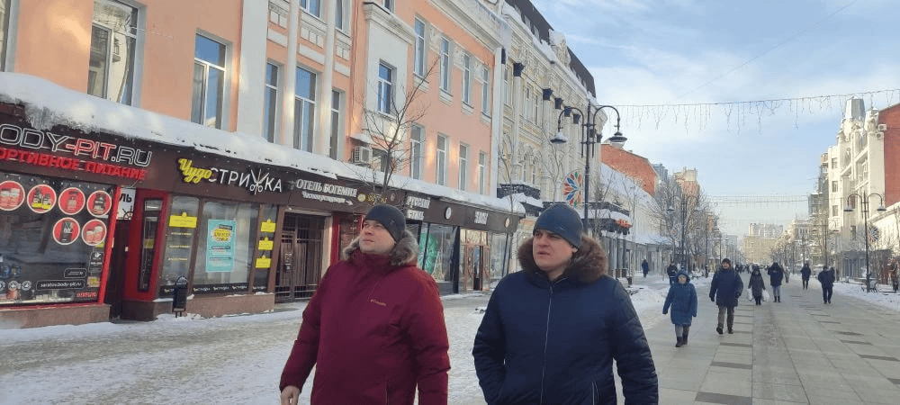 Заместитель главы администрации по экономике Максим Дружинин осмотрел состояние козырьков и прилегающей территории предприятий потребительского рынка.