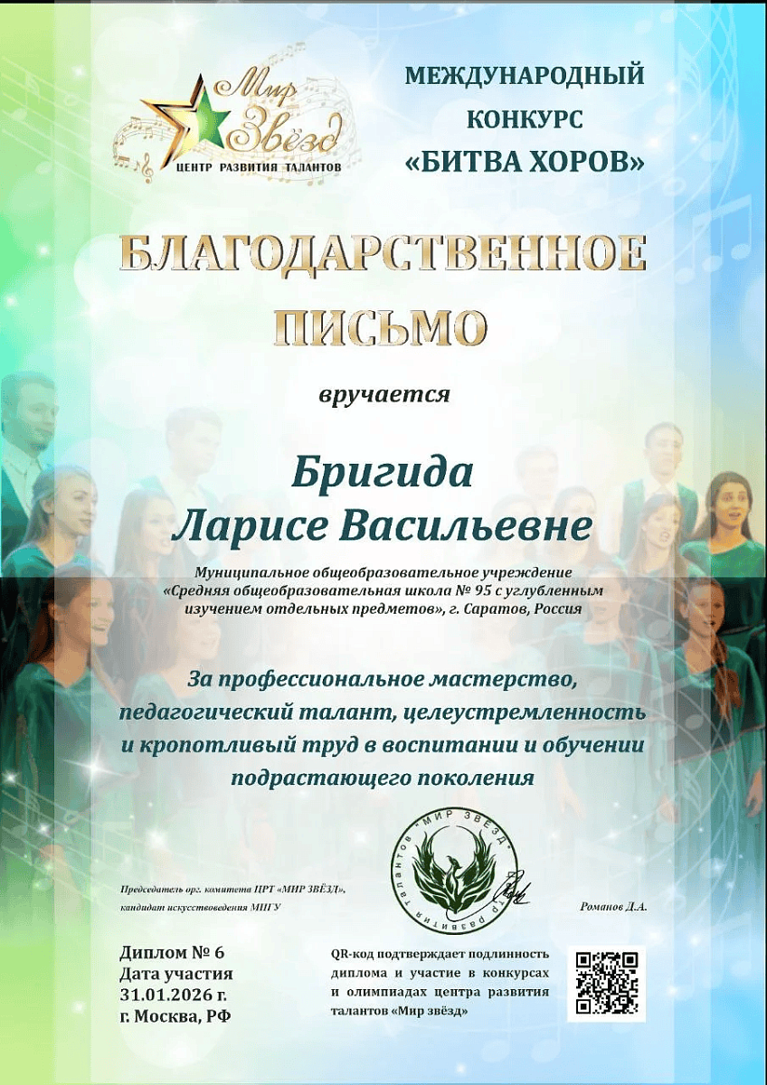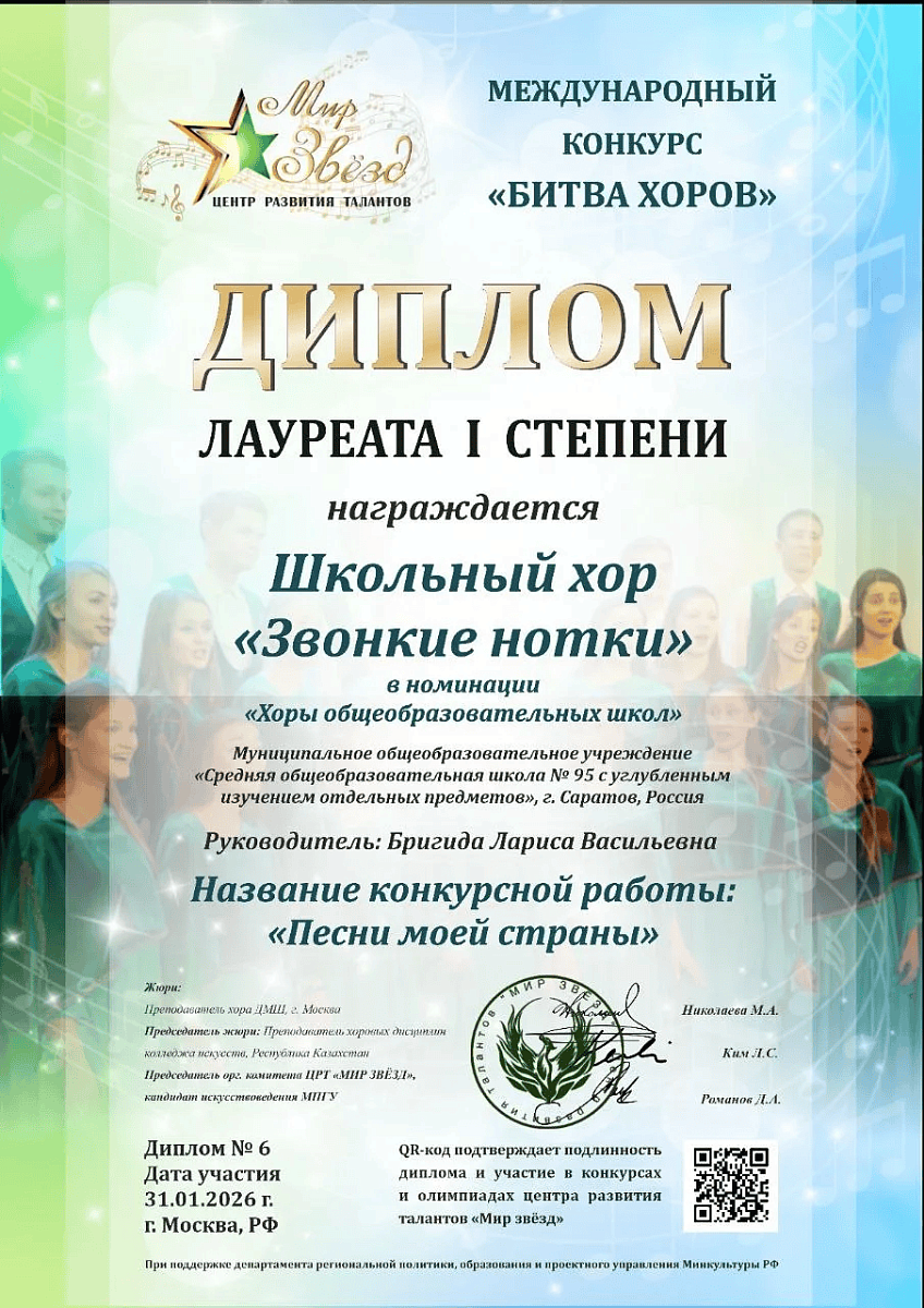 Поздравляем коллектив с победой в конкурсе, а также руководителя хора, учителя музыки Бригида Ларису Васильевну, без которой не было бы такого выдающегося результата. Желаем дальнейших творческих достижений и нескончаемого вдохновения. Впереди вас ждут новые вершины и яркие моменты на пути музыкального совершенствования.