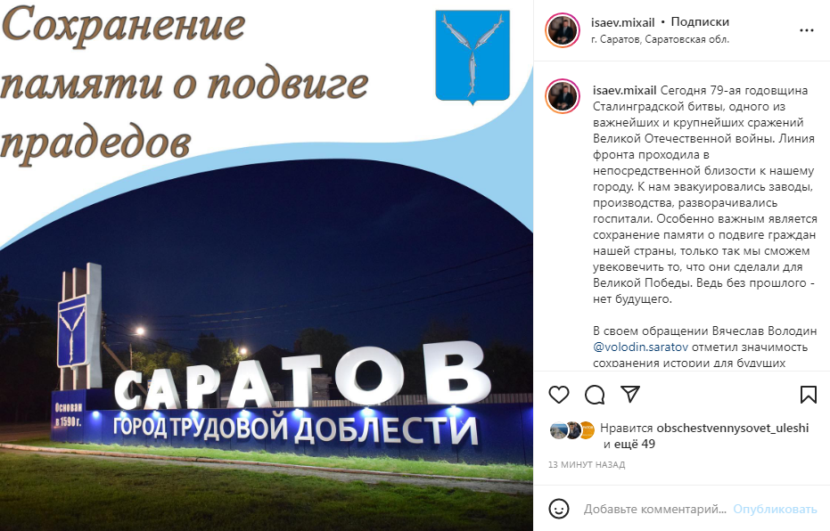 Глава областного центра Михаил Исаев на своей странице в социальной сети Инстаграм отметил, что сегодня отмечается 79-ая годовщина Сталинградской битвы, одного из важнейших и крупнейших сражений Великой Отечественной войны, и рассказал о том, какие действия предпринимаются для сохранения памяти о подвиге прадедов.