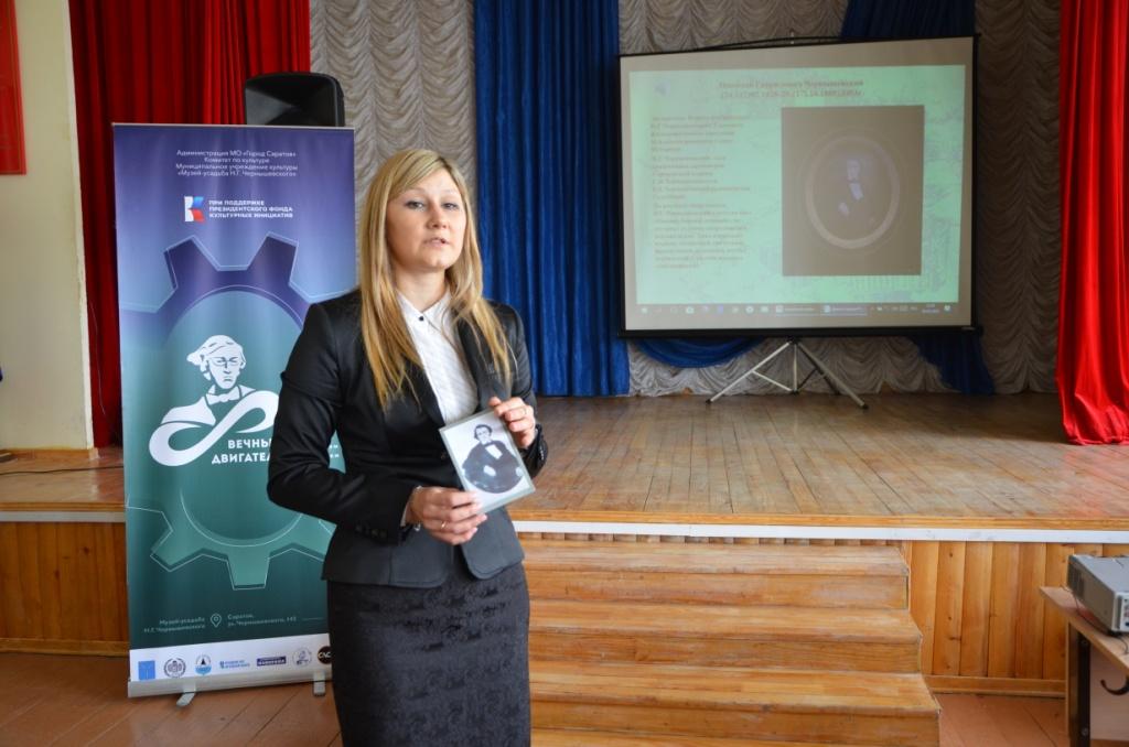 На лектории главный хранитель фонда музея-усадьбы им. Н. Г. Чернышевского Елена Ризаева рассказала о жизни Н.Г. Чернышевского и его семьи, а также продемонстрировала фотографии и альбомы из фонда музея.