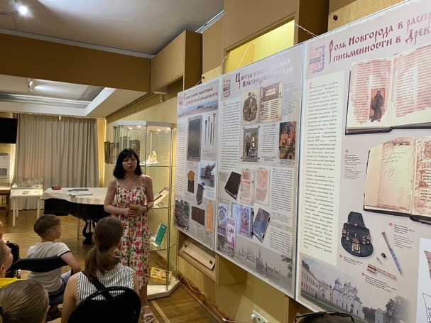 Гости мероприятия познакомились с уникальным комплексом археологических предметов из Новгородского государственного объединенного музея-заповедника: берестяные грамоты XII в., письменные источники разных эпох, чернильные приборы XVII–XX вв., шкатулка и ларец для книг XVII-XVIII вв., грифельная доска и тетрадь, дневник для записывания уроков ученицы женской гимназии, подвижные азбуки, прописи, ручки для письма, латинская азбука, советские буквари.