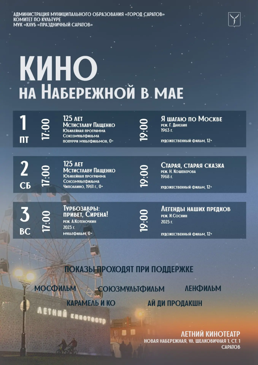 В программе произведения классического кинематографа, документальные фильмы и современные приключенческие ленты. Картины будут интересны для зрителей всех возрастов. Геолокация: Летний кинотеатр на Новой Набережной.