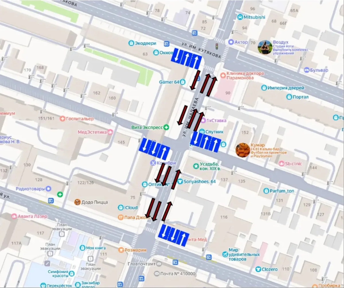 В соответствии с решением комиссии по обеспечению безопасности дорожного движения в муниципальном образовании «Город Саратов» и действующим проектом организации дорожного движения с 30 апреля планируется изменение схемы движения на участке по ул. Чапаева от ул. Московская до ул. Кутякова. Будет нанесена новая дорожная разметка и установлены знаки 5.15.7 «Направление движения по полосам».