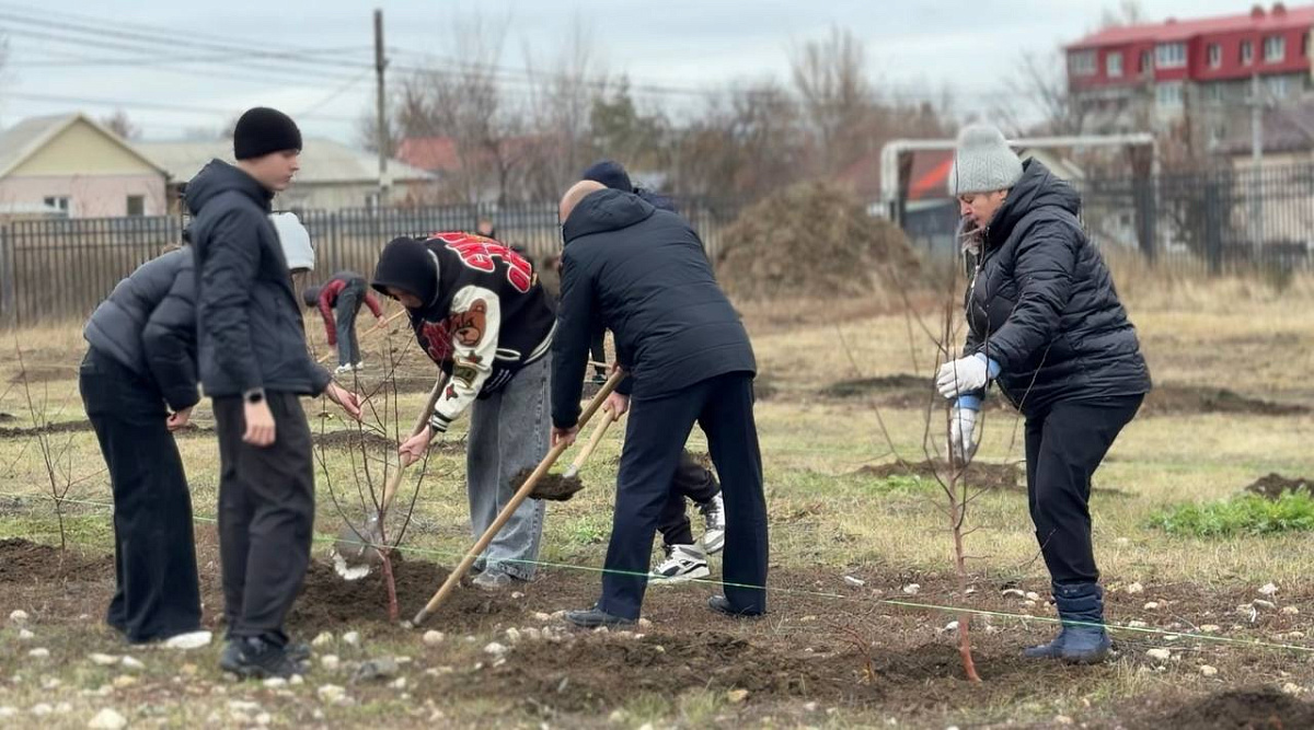 После этого старшеклассники дружно взялись за лопаты. Ребята копали ямки, засыпали плодородный чернозем и бережно высаживали молодые деревца. Всего на территории появилось более 60 яблонь восьми разных видов.