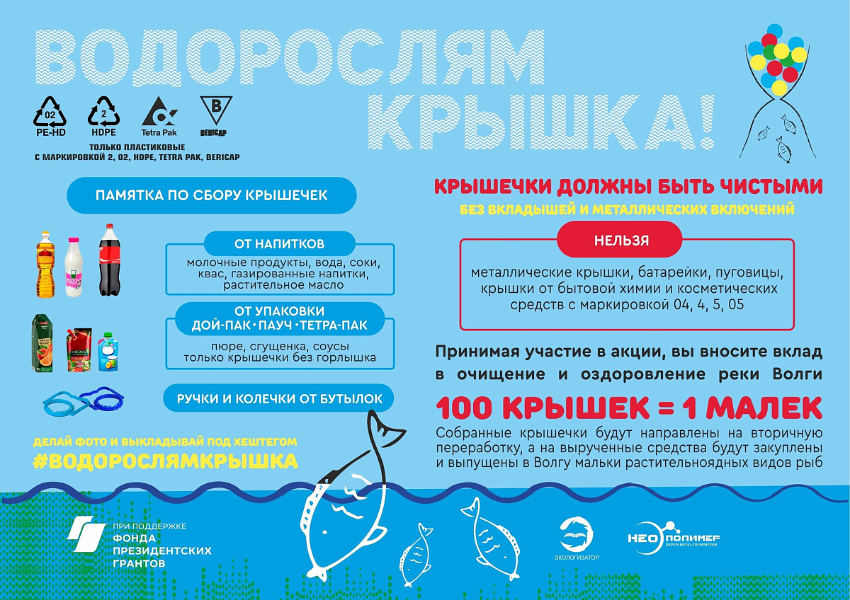 Акция «Водорослям крышка» имеет конкретный результат: все собранные крышечки отправятся на переработку, а вырученные средства пойдут на выпуск мальков в Волгу. Всего 100 крышек спасают одного маленького малька, значит, благодаря усилиям ребят из «Авроры», Волгу наводнит множество рыб. Вместе мы можем влиять на чистоту наших рек, на экологию родного края.